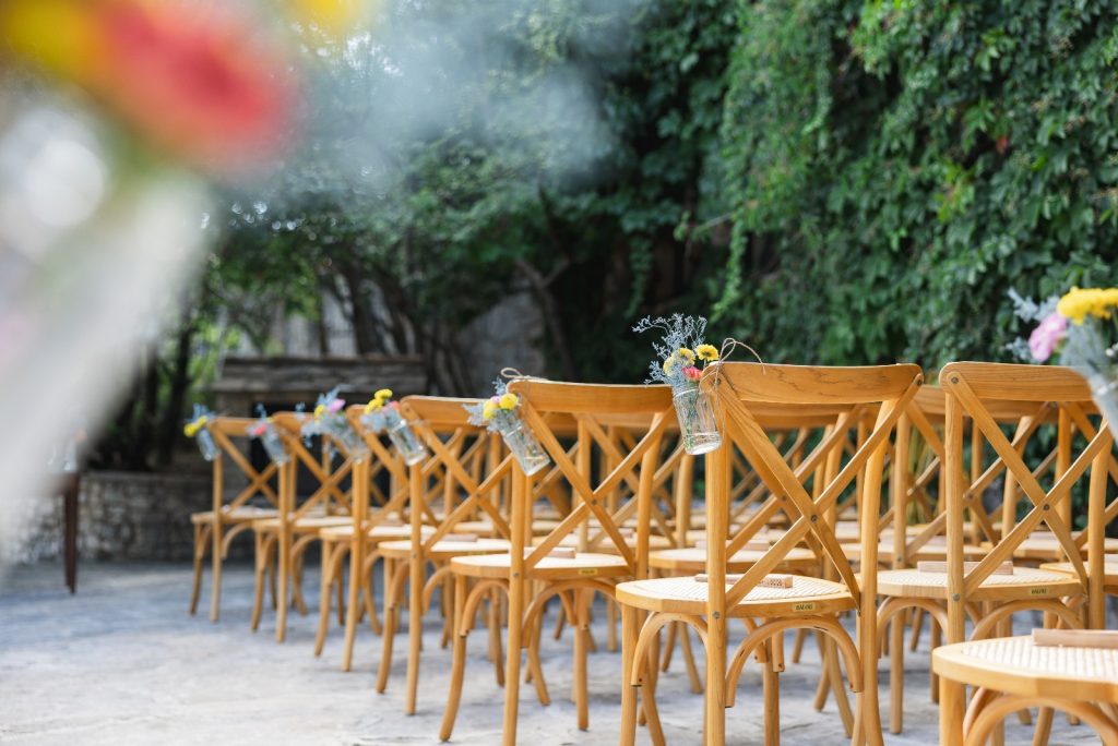 - Wooden crossback chairs x42 for ceremony and round tables and white table linen for your reception
