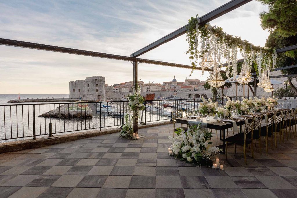 You and your guests will then walk through the historic buildings and alleys of Dubrovnik for about 5 minutes until you reach the breathtaking terraces of you reception venue overlooking the old port. Your wedding party will be greeted with welcome drink at this beautiful venue, followed by three course meal and a generous open bar including wine, beer and spirits. The restaurant terraces look to the open Med and the sunset making this a picture perfect combination for your wedding celebration.