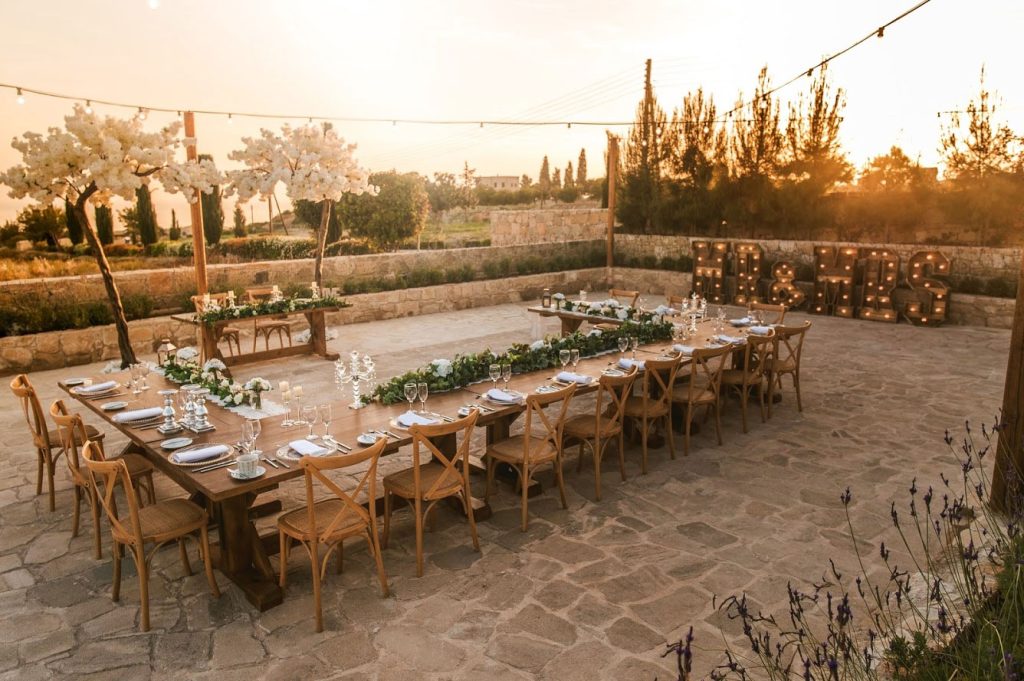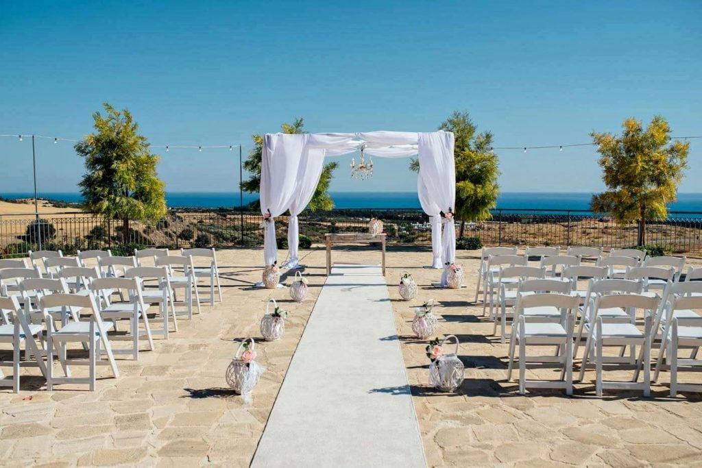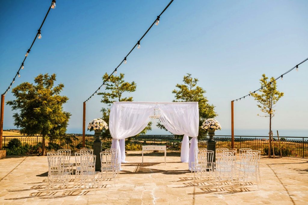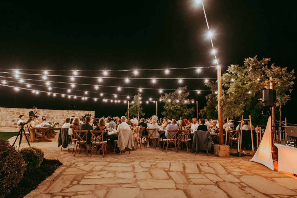 Your ceremony will take place in the Aphrodite Circle, which boasts views out towards the Mediterranean and over the surrounding countryside. Just a few steps away is the reception area, where you will spend your evening being wined and dined. You will also have use of the beautiful rustic wedding suite during the day of the wedding. Adding onto the serene, quiet & magical atmosphere which radiates from the surroundings, the breath taking views of the Mediterranean Sea are the perfect backdrop for your special day. After dark, the 16th Century Farmstead is lit by globe string lighting offering one of the most romantic wedding venues in Cyprus.