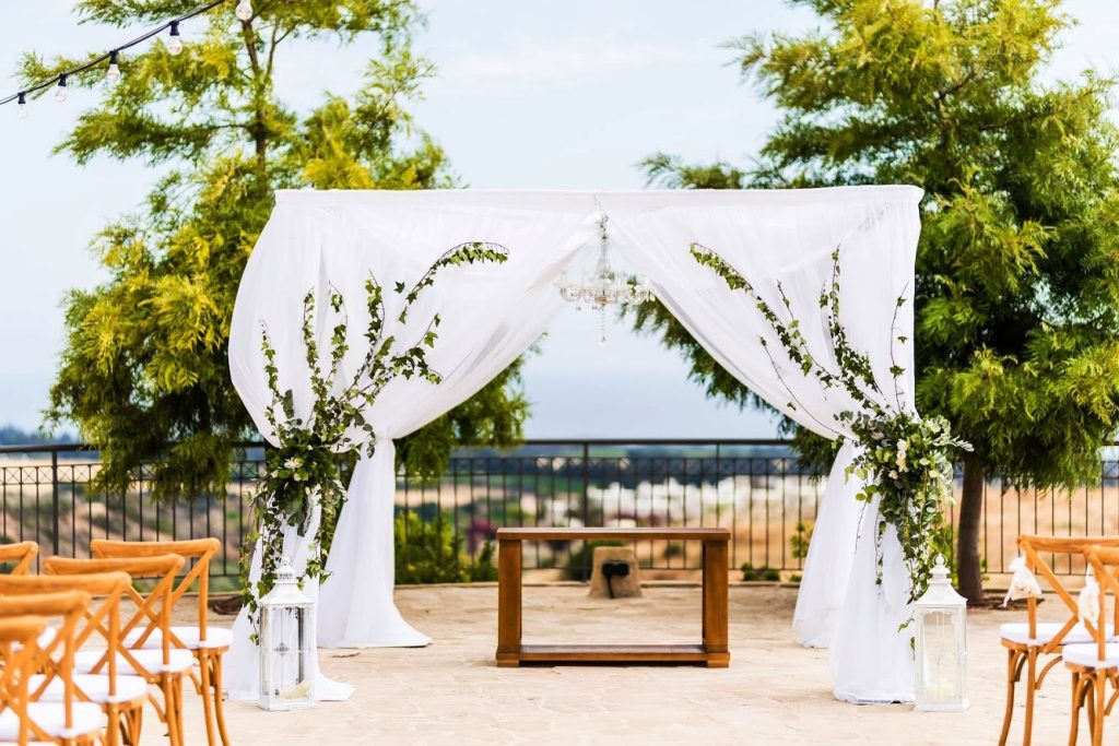 - Decorated wedding ceremony area including Gazebo, wooden bistro chairs & registrar table