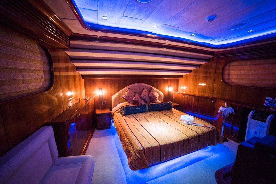 Full width buffet table with 50″ LED screen. Full music system with 40 stereo sound speakers around the yacht. Blue LED lighting fitted in the alacantara ceiling. Cherry wood bar with all facilities.