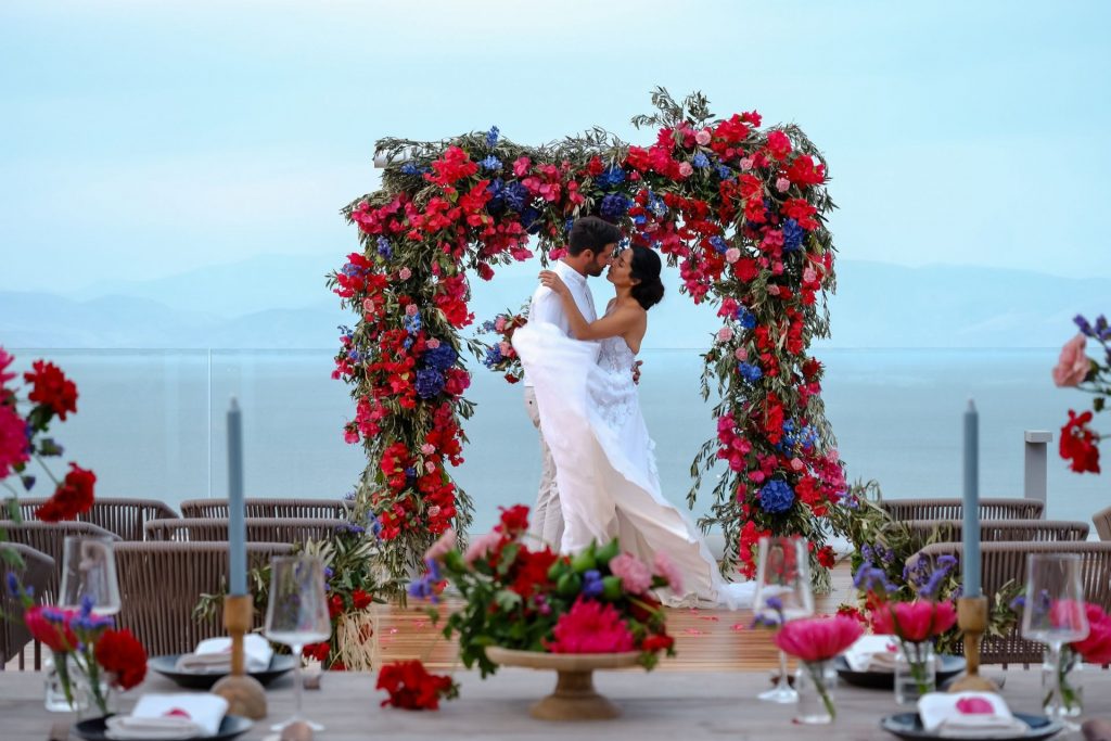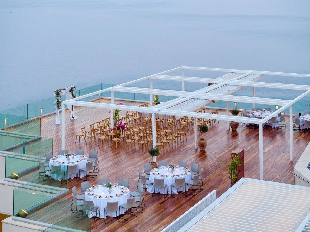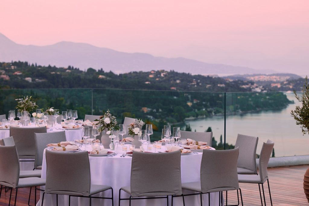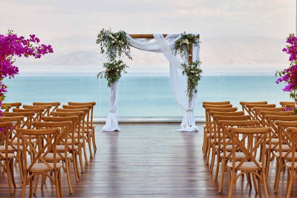 Your ceremony will take place at the front of the decked terrace looking towards the mainland whilst enjoying welcome cocktails and the pink horizon. A wonderful Greek gourmet buffet follows with a large variety of hot and cold dishes and desserts complemented by an open bar with choices of wines, prosecco, beers, spirits and soft drinks. Five star hospitality for your dream day!