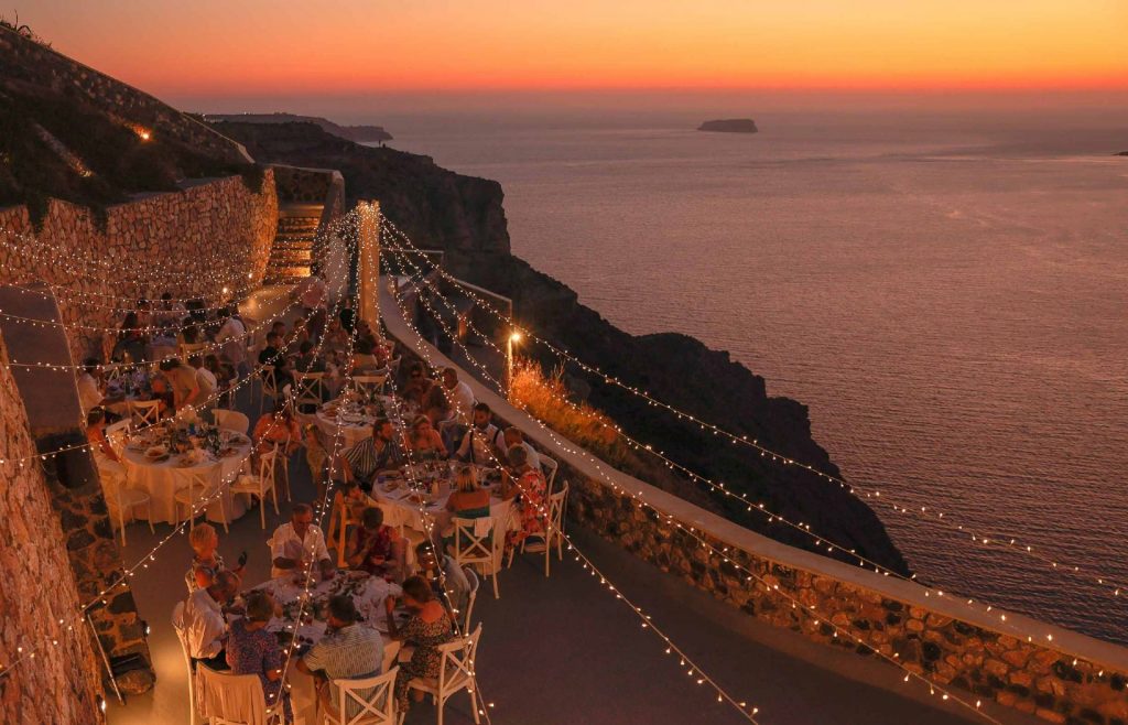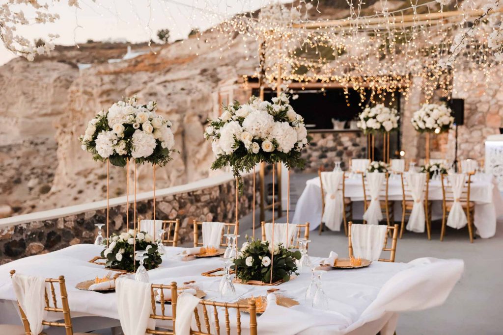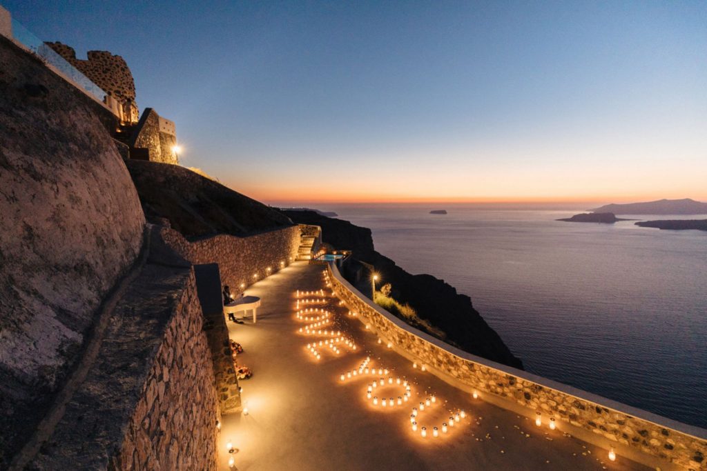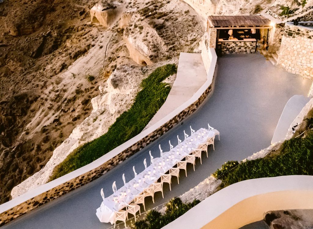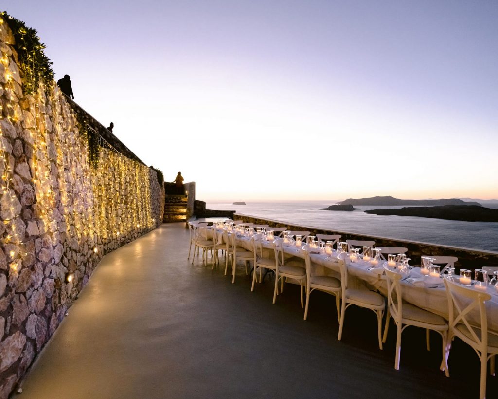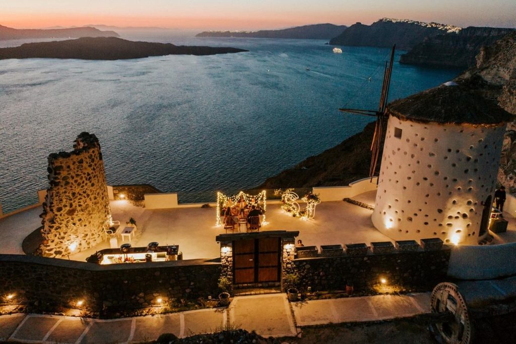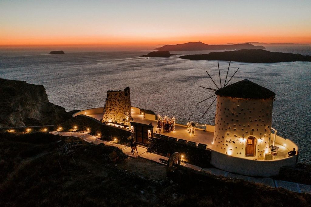 Enjoy your special day at the unique and special Windmill venue in Megalochori, one the most traditional villages of Santorini and heart of the island’s wine country. The setting boasts magnificent panorama of the whole caldera rim and volcanic islets. Your wedding ceremony will take place on the upper terrace by the century-old stone Cycladic windmills, one of which is fully renovated featuring a newlyweds suite. The lower terrace will host your reception with welcome drinks, open bar for the duration of your event and generous buffet whilst watching the famous Santorini sunset.