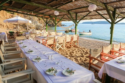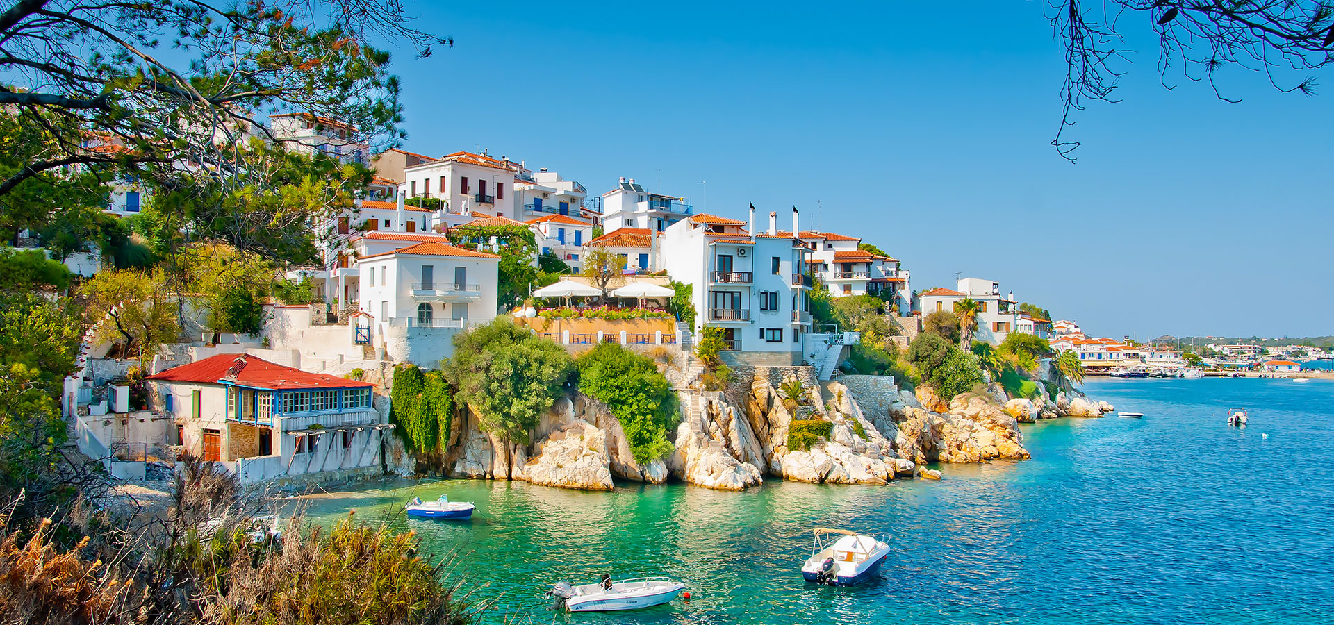 The island boasts no less than 70 sandy beaches and if you choose to hire a boat, you will be rewarded by discovering romantic, deserted beaches, even in peak season. Or you may opt for a more traditional kaiki boat from the old port, similar to the one caught by Colin Firth and Pierce Brosnan in Mamma Mia.