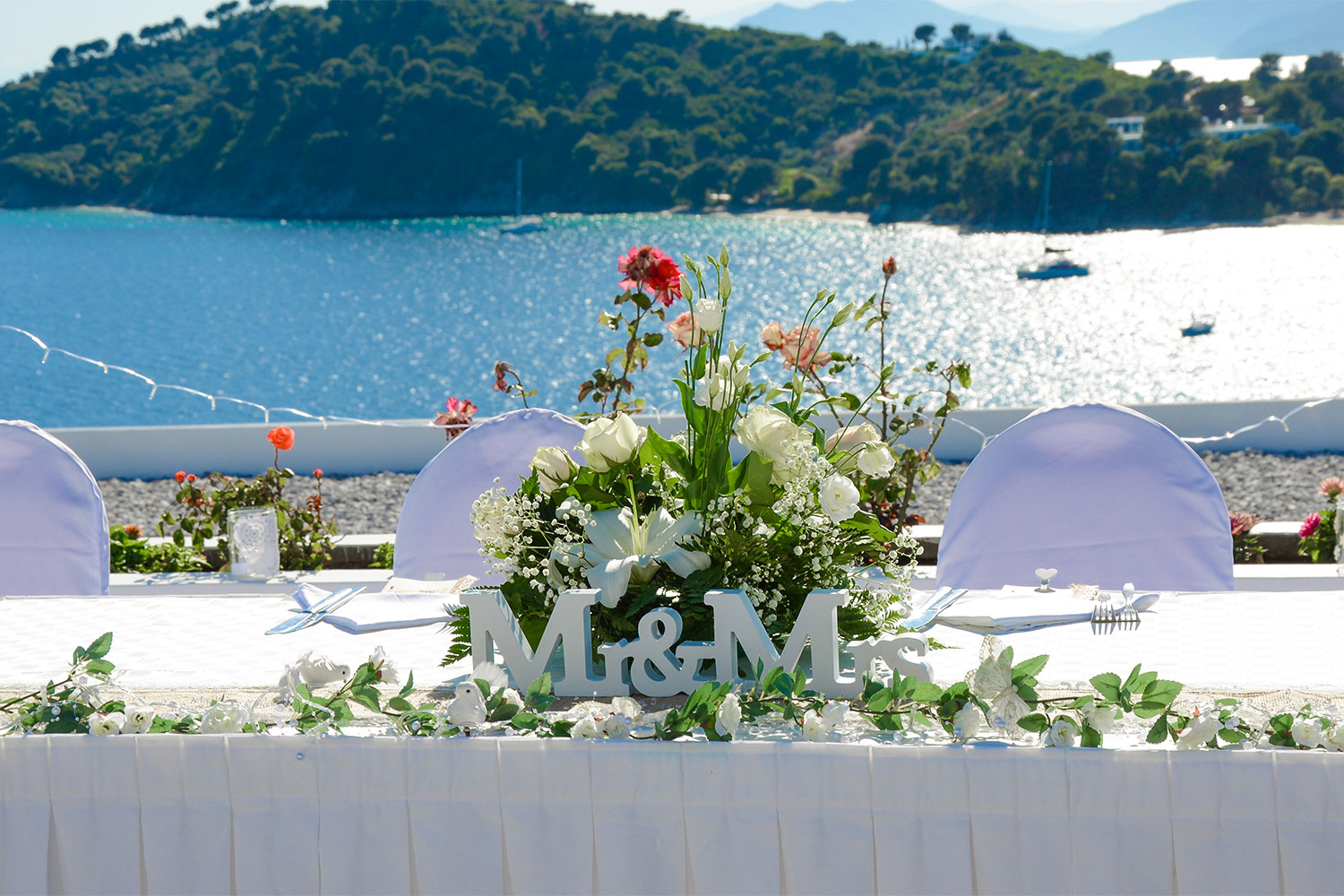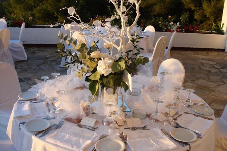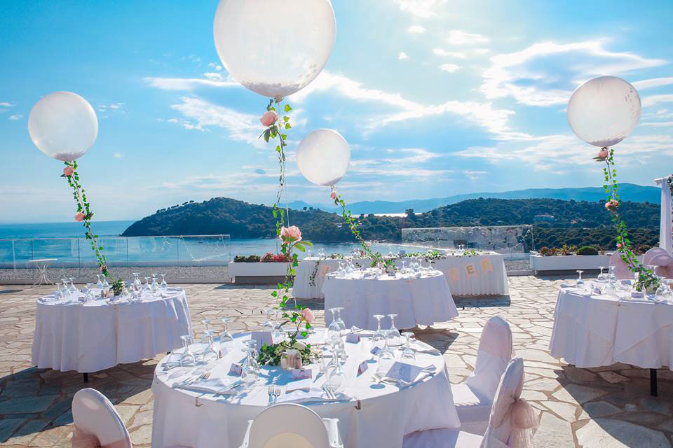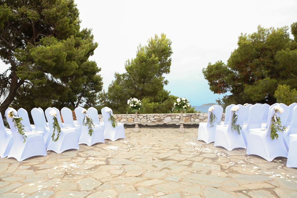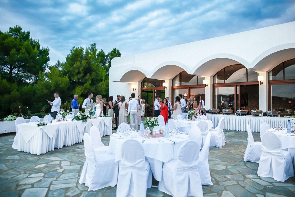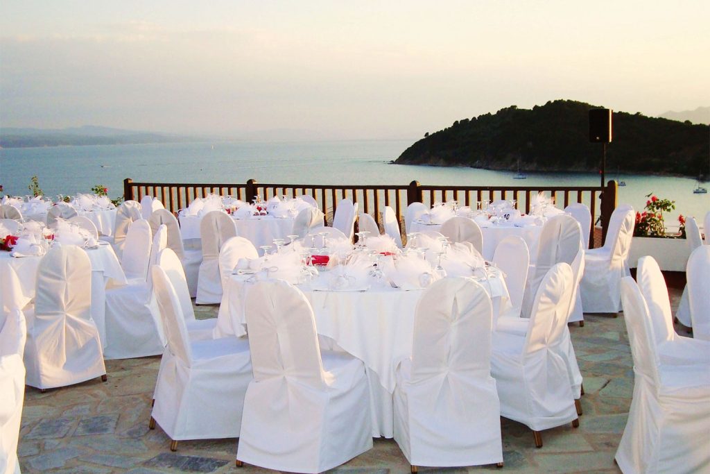 After your ceremony your wedding party will transfer to the Koukounaries Terrace which is approximately a 15 minute drive away from Skiathos Town (10 Km West). Located on a pine hill, in the South West point of Skiathos, the reception venue combines astonishing natural beauty together with breath taking view over the stunning Koukounaries beach. The panoramic view will provide the perfect opportunity to enjoy the picturesque sunset, it is one of the best in the Sporades Islands.