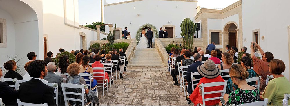 Immersed in an olive grove of 2600 century-old trees and 10 hectares of land, this venue is situated in Puglia’s most spectacular countryside of the Valle d’Itria and just five minutes from the sea. Beneath the masseria are limestone caves, where there once was an old oil mill for producing extra-virgin olive oil, which is still produced by the current owners of the masseria. The caves, now restored, are used as an alternative reception venue and for breakfast. Our proposal includes exclusive hire of this traditional venue for the duration of your wedding day with accommodation for three nights in 13 rooms and suites, sleeping up to 28 guests. Your legal wedding ceremony will be set up in the courtyard in front of the whitewashed chapel. Your wedding reception will be set up in the olive grove, amongst the ancient trees where you and your guests will enjoy a four course meal with wine, beer and soft drinks. This will be followed by coffee & a digestif and then an open bar. We also include a pre-wedding pizza party on your arrival night for 50 persons. We can arrange post wedding events e.g. BBQ, pasta party, pool party.