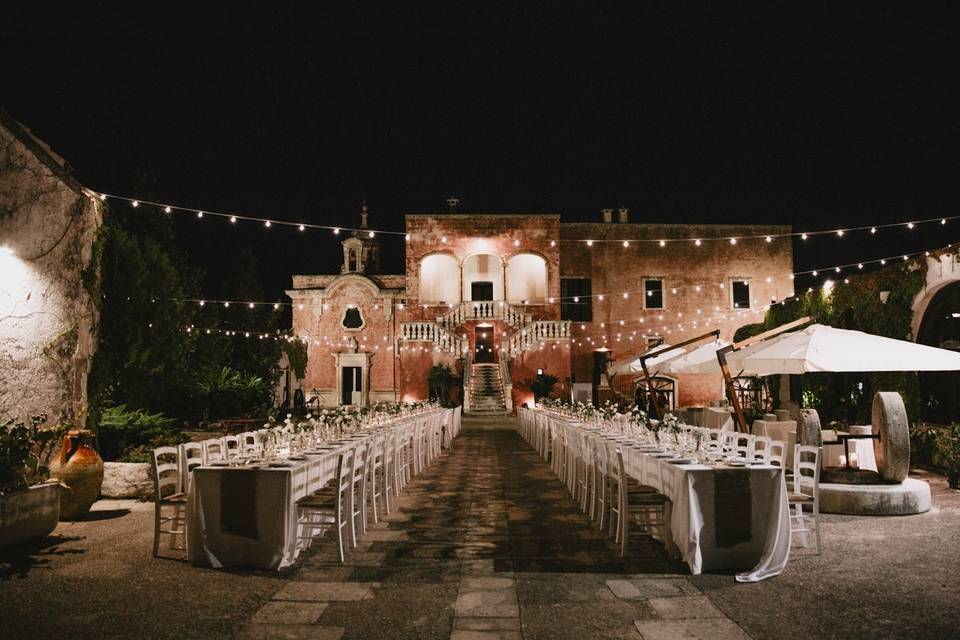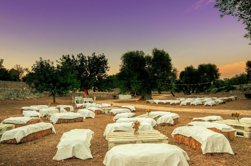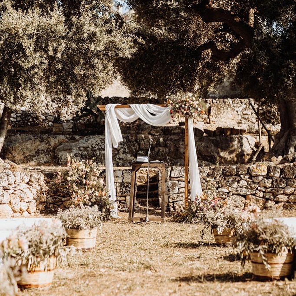The Rustic Puglian Farmhouse is surrounded by seven hectares of grounds and is located just 40 mins from Bari airport. The venue which is now owned by the 7 generation of the same family. It oozes rustic charm and offers you and your guests a traditional Puglian experience. We usually set up the symbolic ceremony under the trees in the centuries-old olive grove, with guests seated on hay bales. Following the ceremony, sparkling wine, soft drinks and local snacks will be served. The reception is set up in the courtyard in front of the majestic main building. A buffet of starters will be offered followed by two further courses and wedding cake. Wine is included during the meal and an open bar afterwards. The venue can accommodate up to 32 of your guests on site in their beautiful historical residences, with additional accommodation available nearby. Our proposal includes exclusive hire of the venue for the wedding day and two nights accommodation. We also include a pre-wedding pizza party for 40 persons.