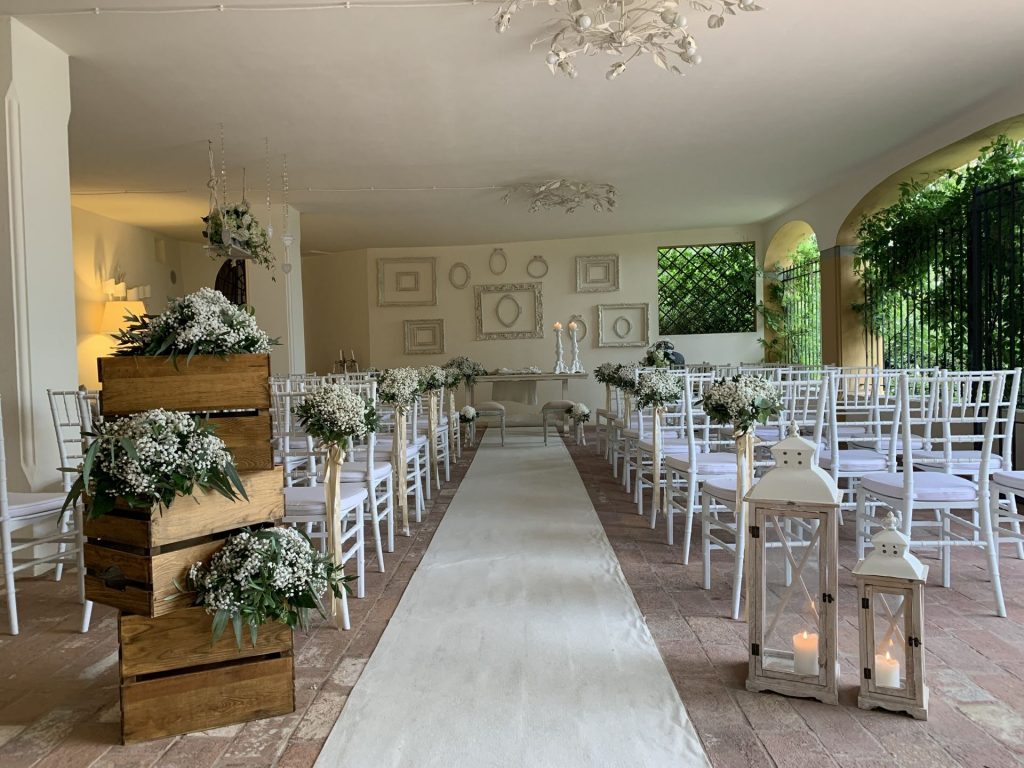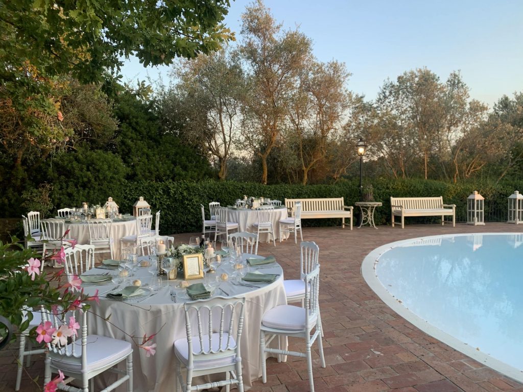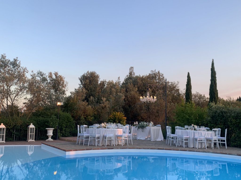 Following a photo shoot around the grounds of the villa, you and your guests will be served with prosecco and an antipasti buffet. The reception can be set up by the pool, on the terrace or in one of two beautiful indoor areas and during this you will be served two pasta courses and a main course, followed by a fruit buffet and wedding cake. Wine is included with the meal and coffee with the wedding cake. Following this, we have arranged a three hour open bar. We have included food and drink in our proposal for up to 40 persons, however the venue can accommodate up to 210. We can book a DJ and entertainment and music is allowed until 1am.
