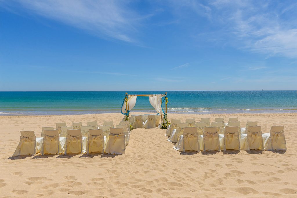 The Palm Tree Gardens is an exquisite venue located between the ocean and a nature reserve and is hired privately for your wedding day. It is around 10 mins drive from Albufeira and 35 mins from Faro airport. Your can opt to have your ceremony beneath the palm trees or (for a supplement) on the expansive soft sand beach just a few minutes walk away.
