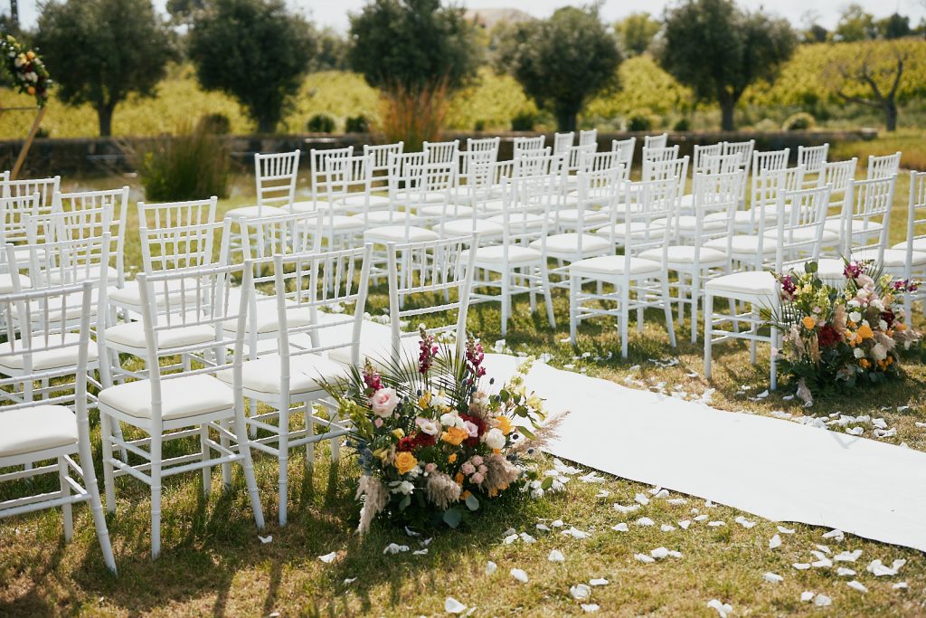 - Set up of ceremony in the gardens with white chiavari chairs, white carpet, ceremony table, floral